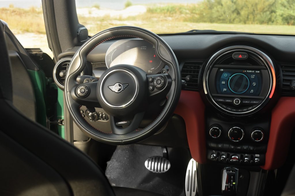 El interior del Mini Cooper S F55 está diseñado con la misma atención al detalle que su exterior. Los materiales de alta calidad y los acabados cuidadosamente seleccionados crean un ambiente acogedor y sofisticado para los ocupantes. La combinaicon negara con detalles rojos del interior, le dan un toque deportivo, el cual se complementa con las butacas, las cuales ofrecen excelente soporte para un menjo agresivo.