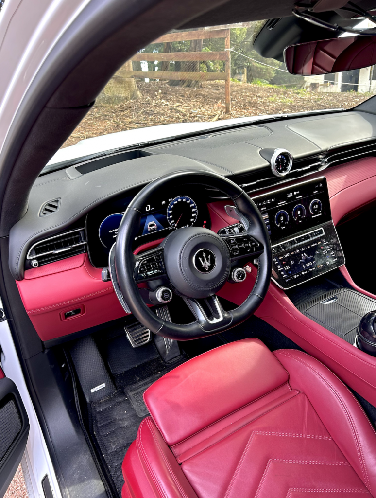 Por dentro, la Trofeo es Maserati en su máxima expresión: cuero perforado, Alcántara, fibra de carbono y detalles en aluminio cepillado crean un ambiente que mezcla lujo y deportividad como pocos. La posición de manejo es baja, abrazada por butacas deportivas que te sostienen con firmeza sin dejar de ser cómodas. Y aunque todo es digital —instrumental, sistema multimedia, climatización— el alma sigue siendo analógica. Todo lo que tocás transmite calidad y carácter.